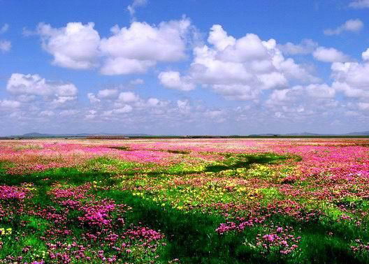 據(jù)當(dāng)?shù)啬撩窠榻B:每到這個季節(jié),會有許多百里之外的游人到這里來看花,今年由于雨水充沛,花開的更密更艷,來的人也比往年多,僅一個牧業(yè)村的草場一天就有數(shù)百人次來看花照像。