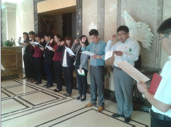 出色的業(yè)績(jī)?cè)从趯I(yè)的團(tuán)隊(duì),專業(yè)的團(tuán)隊(duì)源于點(diǎn)滴的努力。5月16日早上10:00整,由人力資源部總監(jiān)兼部長(zhǎng)鐘江華牽頭,與銷售中心全員針對(duì)晨會(huì)的流程進(jìn)行演練,以此來規(guī)范并確定晨會(huì)的相關(guān)事宜。