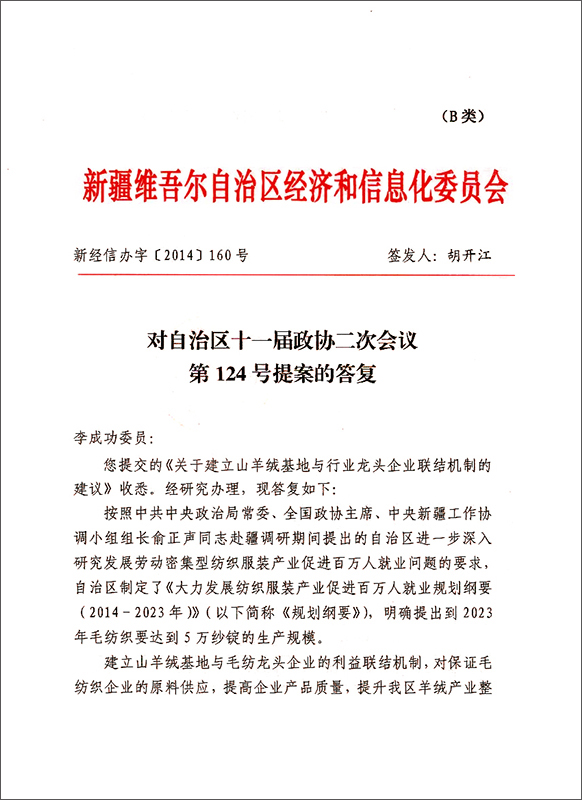 自治區(qū)經(jīng)信委在4月22日印發(fā)的新經(jīng)信辦字(2014)160號文件對自治區(qū)十一屆政協(xié)二次會議第124號提案的答復(fù)中,已明確了將華春毛紡工業(yè)園的發(fā)展納入自治區(qū)發(fā)展紡織服裝產(chǎn)業(yè)促進(jìn)百萬人就業(yè)計劃,并將進(jìn)一步加大就業(yè)政策支持力度。