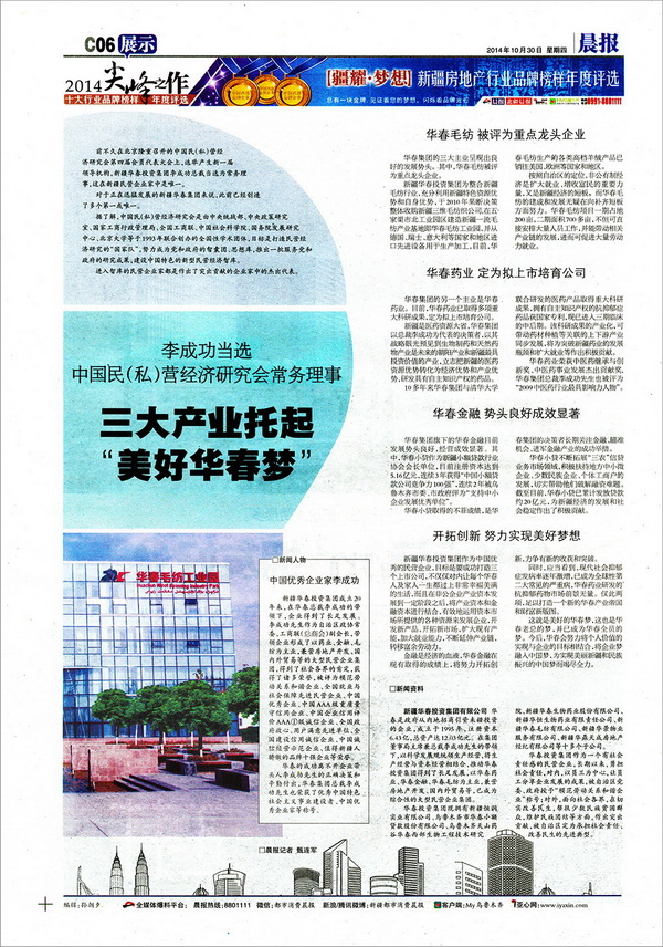 10月30日的《晨報(bào)》于C06版用整版篇幅,以“李成功當(dāng)選中國(guó)民(私)營(yíng)經(jīng)濟(jì)研究會(huì)常務(wù)理事,三大產(chǎn)業(yè)托起美好華春夢(mèng)”為題,對(duì)華春大業(yè)進(jìn)行了專(zhuān)題報(bào)道。
