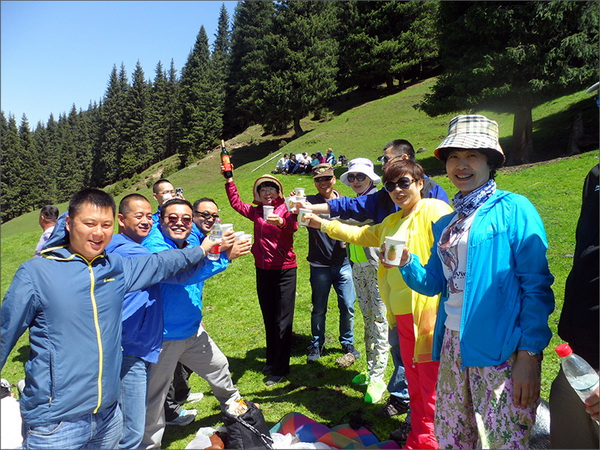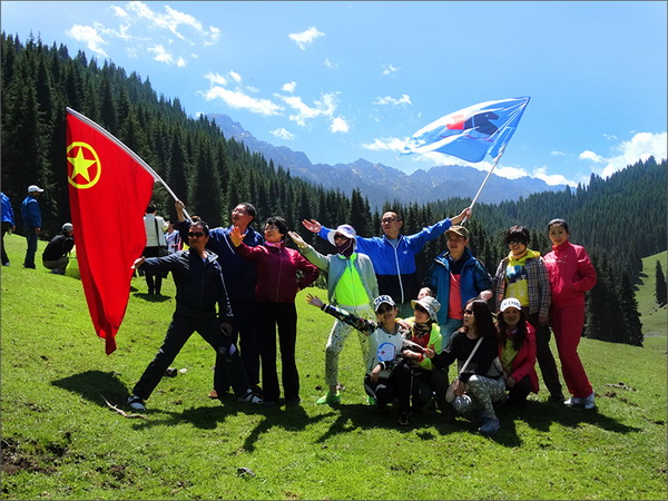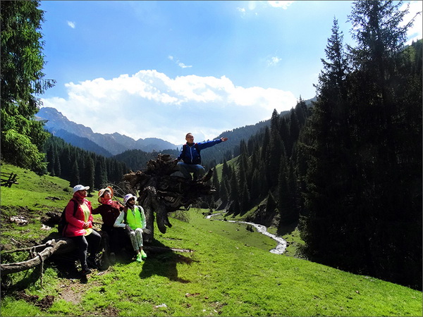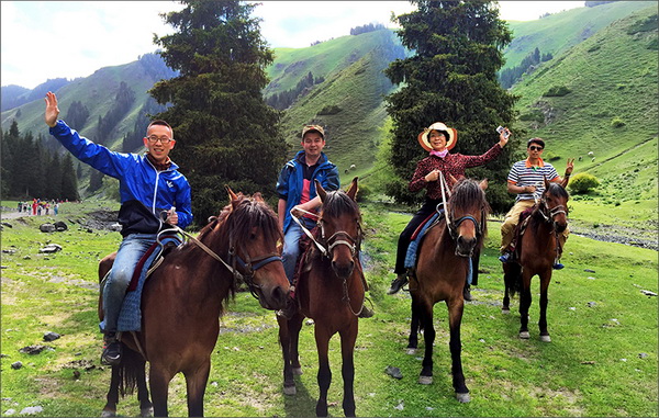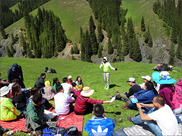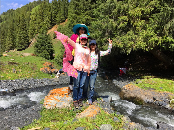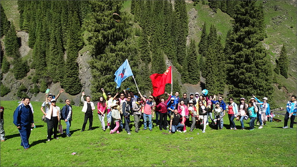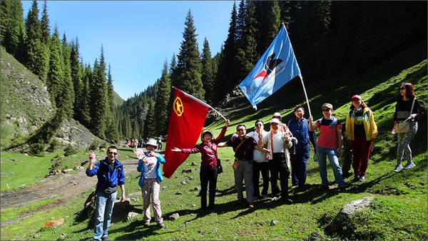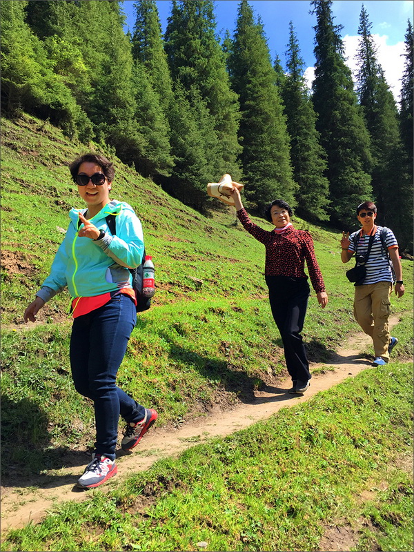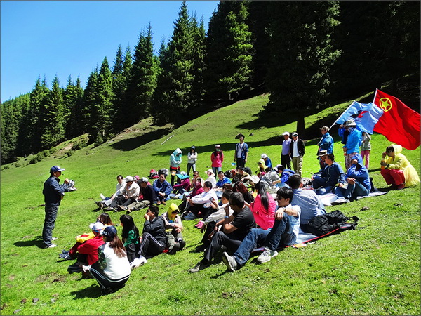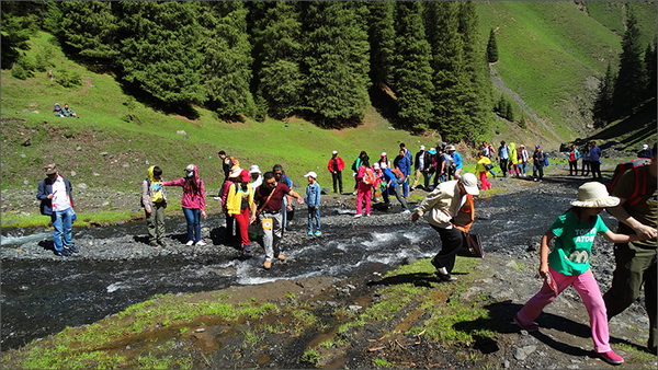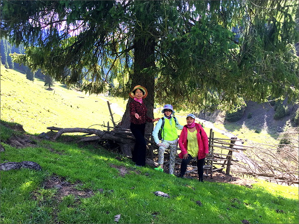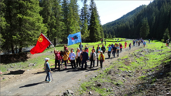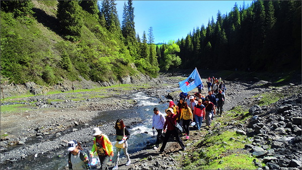 從喧囂的都市來到南山群山中風(fēng)景優(yōu)美的溝谷之一沙溝,這個(gè)位于北天山支脈北麓的山區(qū),集中的展現(xiàn)著大美新疆的妙景。深邃的峽谷,蒼翠欲滴,在重峰疊嶂、唯有山羊才能攀巖上去的危崖聳立之處,一條蜿蜒的山道出其不意在期待著我們的步伐,眼前豁然開闊。在如茵的草坡,山花吐艷。白色的氈房點(diǎn)綴著一派綠色美景,不由得想起一句歌詞:氈房好似珍珠撒。盡管當(dāng)今已難免的染上了一抹市場(chǎng)經(jīng)濟(jì)的色彩,但當(dāng)哈薩克牧民的羊群從我們徒步隊(duì)伍中穿過時(shí),立馬提醒著后人,這個(gè)俊美的山區(qū)從唐代就曾是著名的牧區(qū)狩獵區(qū),霎時(shí)有一種在時(shí)空中穿梭的感覺。