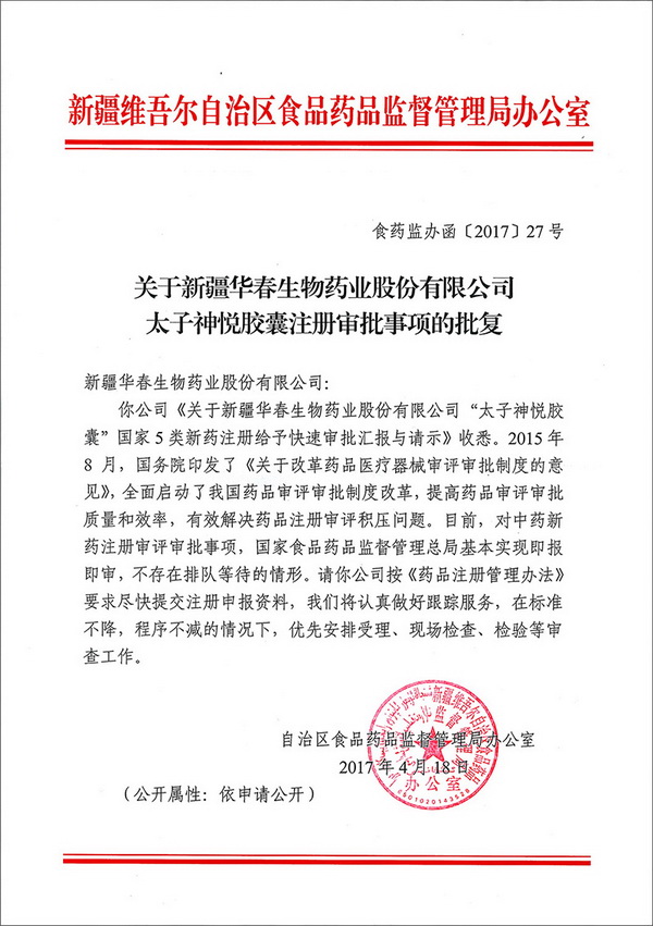 日前,自治區(qū)藥監(jiān)局對新疆華春生物藥業(yè)股份有限公司關(guān)于抗抑郁新藥太子神悅膠囊注冊審批事項作出批復(fù):國家食品藥品監(jiān)督管理總局基本實現(xiàn)即報即審,不存在排隊等待的情形。請你公司按《藥品注冊管理辦法》要求盡快提交注冊申報資料,我們將認(rèn)真做好跟蹤服務(wù),在標(biāo)準(zhǔn)不降,程序不減的情況下,優(yōu)先安排受理、現(xiàn)場檢查、檢驗等審查工作。