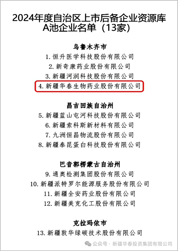 為優(yōu)化充實新疆上市資源,提升自治區(qū)上市后備企業(yè)資源庫整體質量,培育更多優(yōu)質企業(yè)赴多層次資本市場上市掛牌和融資,讓實體企業(yè)更好地參與和服務建設自治區(qū)“八大產業(yè)集群”,3月4日,自治區(qū)地方金融管理局公示了2024年度入庫上市后備企業(yè)名單,新疆華春生物藥業(yè)股份有限公司(簡稱華春藥業(yè))又被列入后備企業(yè)資源庫A池。