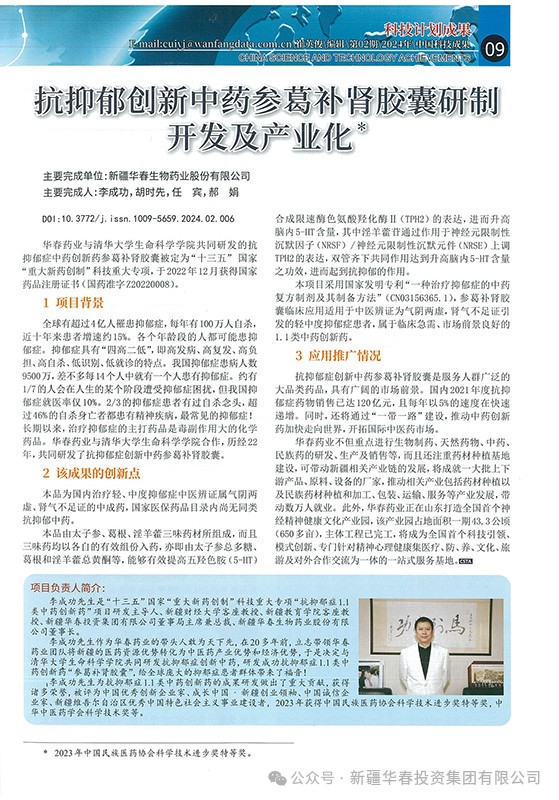 《中國(guó)科技成果》期刊發(fā)表 華春藥業(yè)抗抑郁創(chuàng)新中藥研究成果