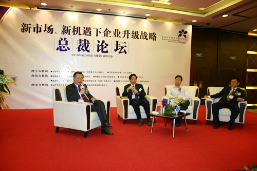 圖為:香港理工大學(xué)院長高級顧問曾慶忠在論壇上主持由新疆華春投資集團有限公司董事局主席兼總裁李成功、西子聯(lián)合控股有限公司董事長王水福、賽維LDK太陽能有限公司董事長兼總裁彭小峰參加的《強強合作企業(yè)騰飛戰(zhàn)略》專題討論。