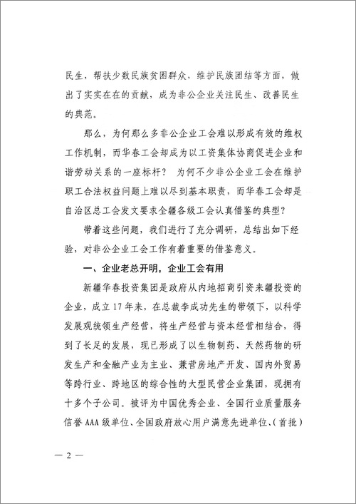 近日,自治區(qū)黨委政研室對新疆華春投資集團工會委員會的典型成功經(jīng)驗進行了深入調(diào)研,發(fā)了題為《發(fā)揮非公有制企業(yè)工會作用的成功經(jīng)驗值得推廣》的專報。結(jié)論是:新疆華春工會的實踐證明,非公企業(yè)工會有干不完的工作,不是可有可無,而是大有可為!這是在自治區(qū)黨委這個層面上,首次對全疆非公有制企業(yè)工會的肯定。