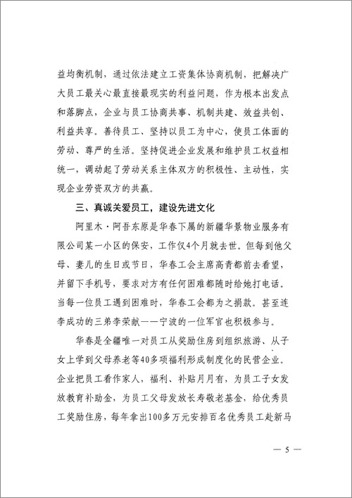 專報認為:新疆華春工會就是個例外。對內(nèi),建設(shè)規(guī)范有序、公正合理、互利共贏、和諧穩(wěn)定的社會主義新型勞動關(guān)系,促進企業(yè)發(fā)展,維護員工權(quán)益,率先簽訂工資集體協(xié)商合同,勞資雙方高度和諧,實現(xiàn)企業(yè)與員工的雙贏,被自治區(qū)黨委、政府授予“模范勞動關(guān)系和諧企業(yè)”稱號;