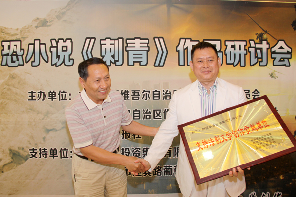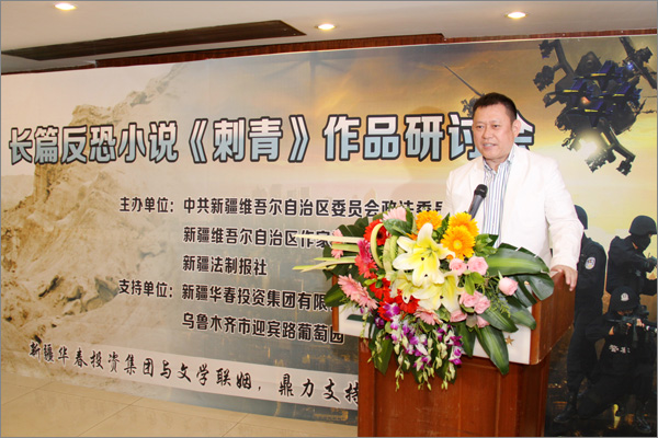 由自治區(qū)黨委政法委、作家協(xié)會、新疆法制報社主辦的、由新疆華春投資集團鼎力資助支持的法制文學(xué)創(chuàng)作“長篇反恐小說《刺青》作品研討會”,于2012年6月10日在鴻鑫酒店舉行。自治區(qū)黨委政法委授予新疆華春投資集團為“支持法制文學(xué)創(chuàng)作貢獻單位”,頒發(fā)了獎牌。新疆華春投資集團李成功總裁、王春容董事與華春集團統(tǒng)戰(zhàn)部、外事、工會的負責(zé)人參加了研討會。