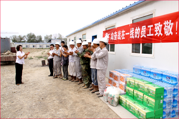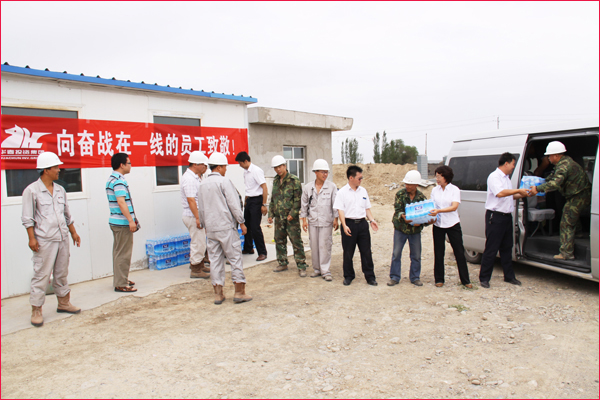 6月30日,新疆華春投資集團(tuán)工會主席高青和行政辦副主任鄭培君、華春集團(tuán)子公司新疆恒潤實(shí)業(yè)有限公司辦公室主任及集團(tuán)編輯部全員一行,將一箱箱的統(tǒng)一綠茶和茉莉蜜茶、一件件的純凈水及綠豆、冰糖、白糖等降溫防暑飲料與物品,送給奮戰(zhàn)在五家渠華春毛紡工業(yè)園項(xiàng)目建設(shè)工地的一線員工,同時也送去了李成功總裁和華春全員的關(guān)愛之心。一線員工們接到公司送來的慰問品,深深感受到公司的關(guān)懷,“感謝李總裁對我們的關(guān)心!謝謝公司對我們的慰問看望!”