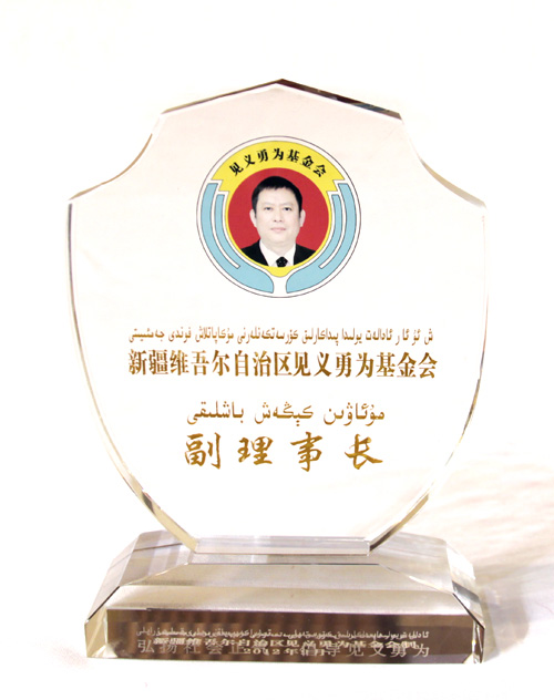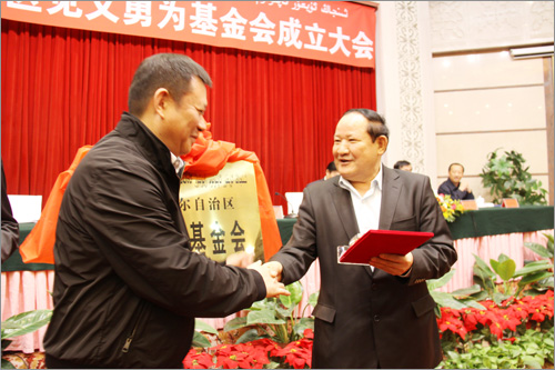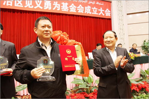 自治區(qū)見義勇為基金會(huì)成立大會(huì)于2012年10月19日上午在自治區(qū)人民大會(huì)堂多功能廳隆重舉行,新疆華春投資集團(tuán)董事局主席兼總裁李成功先生當(dāng)選自治區(qū)見義勇為基金會(huì)首屆理事會(huì)副理事長(zhǎng),自治區(qū)副主席、黨委政法委副書記賈帕爾•阿比布拉為李總裁頒發(fā)了副理事長(zhǎng)證書和座牌。