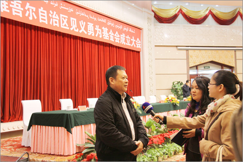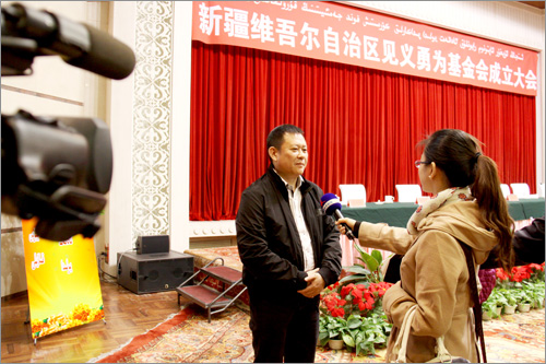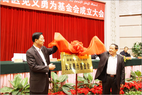 和新疆見義勇為基金會(huì)首屆理事長(zhǎng)張國(guó)梁為基金會(huì)揭牌