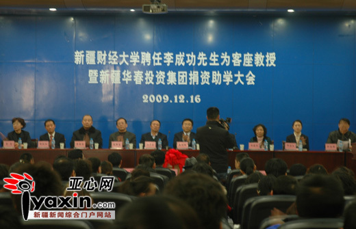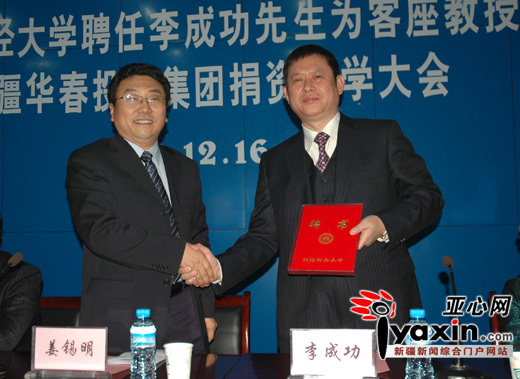 亞心網(wǎng)iyaxin.com訊(本網(wǎng)記者 邱鳴)12月16日下午,新疆華春投資集團(tuán)董事局主席兼總裁李成功接受了新疆財(cái)經(jīng)大學(xué)副校長姜錫明頒發(fā)的聘書,成為新疆財(cái)經(jīng)大學(xué)客座教授。