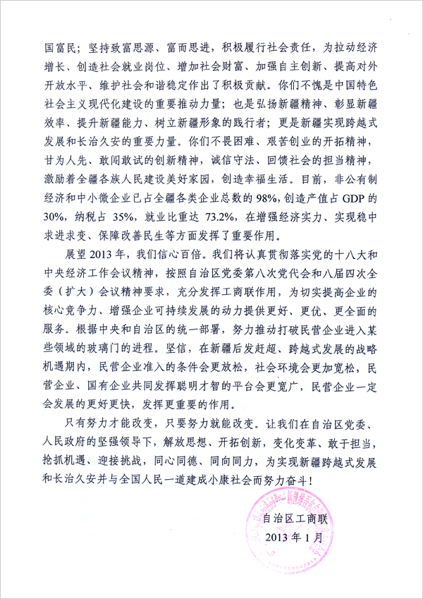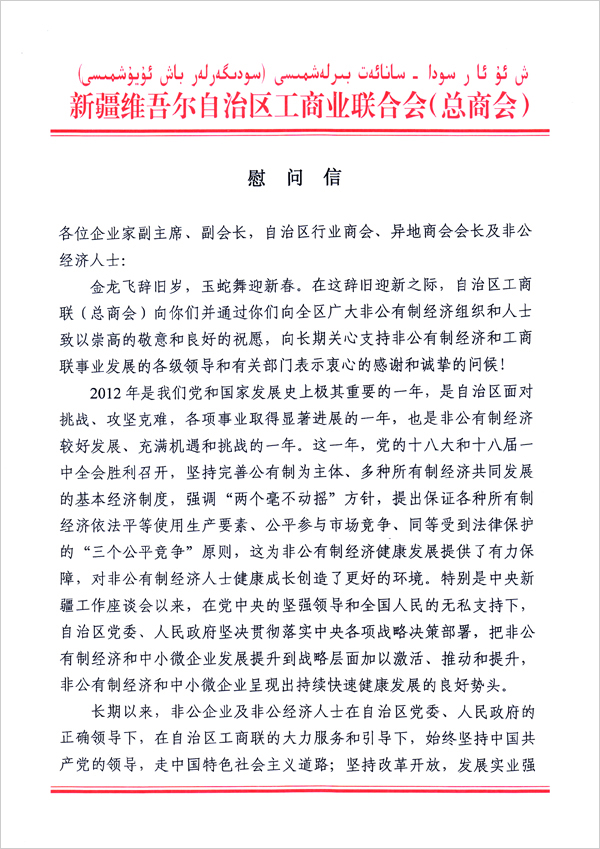 2013年1月17日,自治區(qū)工商聯(lián)黨組成員、自治區(qū)工商聯(lián)副主席努爾力•尤努斯和自治區(qū)工商聯(lián)光彩辦副主任陳風(fēng)玫一行2人,春節(jié)前代表自治區(qū)工商聯(lián)主席及黨組來華春投資集團慰問企業(yè)家副會長李成功總裁并送上自治區(qū)工商聯(lián)黨組的慰問信和鮮花。