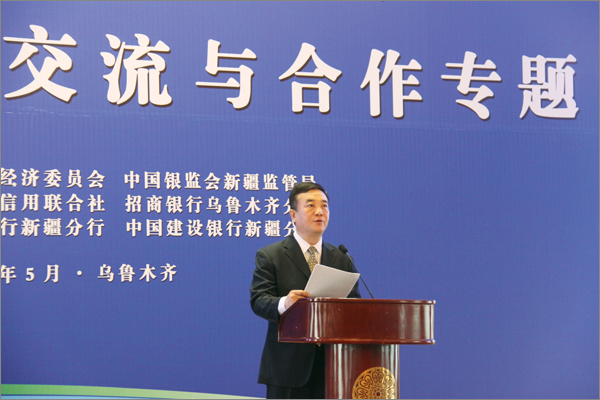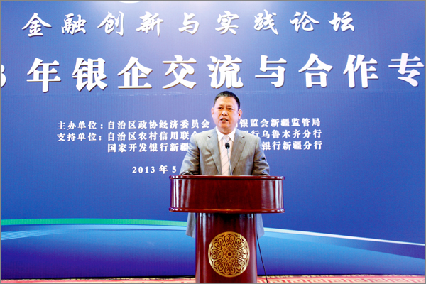由自治區(qū)政協(xié)、中國銀監(jiān)會(huì)新疆監(jiān)管局主辦的首屆新疆金融創(chuàng)新與實(shí)踐論壇——2013年銀企交流與合作專題于5月10日在烏魯木齊昆侖賓館隆重開幕。自治區(qū)政協(xié)主席努爾蘭•阿不都滿金出席論壇并致辭,自治區(qū)副主席錢智作重要講話。自治區(qū)人大、政府、政協(xié)等領(lǐng)導(dǎo)出席論壇開幕。自治區(qū)和兵團(tuán)學(xué)者、金融專家、新疆境內(nèi)多家商業(yè)銀行、非銀行金融機(jī)構(gòu)代表,中小微企業(yè)、商會(huì)負(fù)責(zé)人等400余人齊聚一堂,20位來自政府相關(guān)部門、金融監(jiān)管和金融機(jī)構(gòu)、小微企業(yè)和非銀行金融機(jī)構(gòu)的人士作了專題發(fā)言。新疆華春集團(tuán)李成功總裁、常青副總裁2位代表做精彩演講。