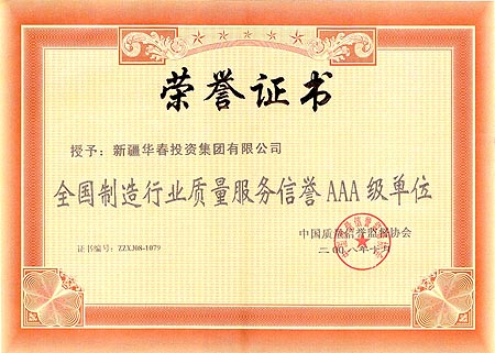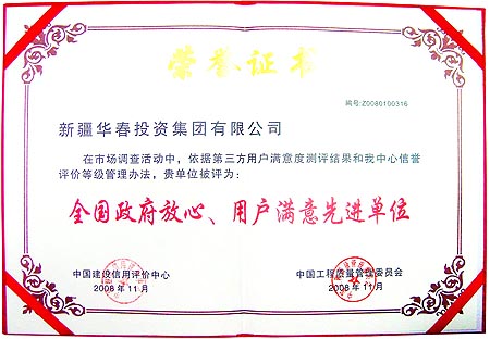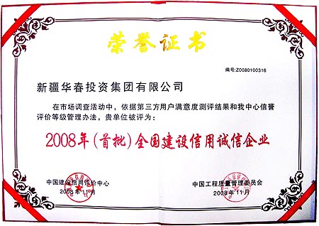 在不平凡的2008年即將逝去之時,新疆華春投資集團以其實際,贏得了相應(yīng)的眾多榮譽:10月被中國質(zhì)量信譽監(jiān)督協(xié)會評為全國制造行業(yè)質(zhì)量服務(wù)信譽AAA級單位;11月被中國建設(shè)信用評價中心、中國工程質(zhì)量管理委員評為 “2008年(首批)全國建設(shè)信用誠信企業(yè)”和“全國政府放心、用戶滿意先進單位”,頒發(fā)了獎牌和證書(證書編號:Z0080100316)。